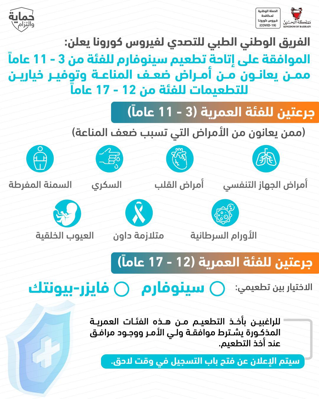 أعلن الفريق الوطني الطبي للتصدي لفيروس كورونا عن موافقة أعضاء لجنة التطعيمات بمملكة البحرين على تطعيم الفئة العمرية من 3 إلى 11 عاماً ممن يعانون من الأمراض التي تسبب ضعف المناعة، بتطعيم (سينوفارم) المضاد لفيروس كورونا بجرعتين، وذلك بعد أن تدارست اللجنة جميع التوصيات الصادرة والمتعلقة بتوفير الحماية الكافية لهذه الفئة عبر تقديم التطعيم، من أجل الحفاظ على صحتهم وسلامتهم من خلال اكتساب المناعة ضد الفيروس.