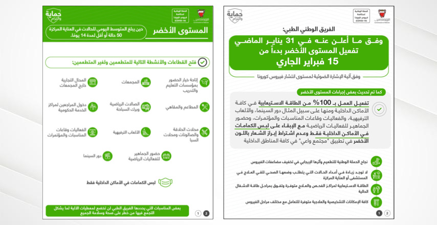 وفق ما أعلن عنه في 31 يناير الماضي، وبعد العرض وأخذ موافقة اللجنة التنسيقية، أعلن الفريق الوطني الطبي للتصدي لفيروس كورونا (كوفيد-19) تفعيل المستوى الأخضر بدءاً من يوم الثلاثاء الموافق 15 فبراير الجاري بعد أن تم تفعيل المستوى الأصفر في الفترة السابقة احترازيا بالرغم من أن المتوسط اليومي لعدد الحالات في العناية المركزة، لم يتطلب وقتها الانتقال للمستوى الأصفر.
